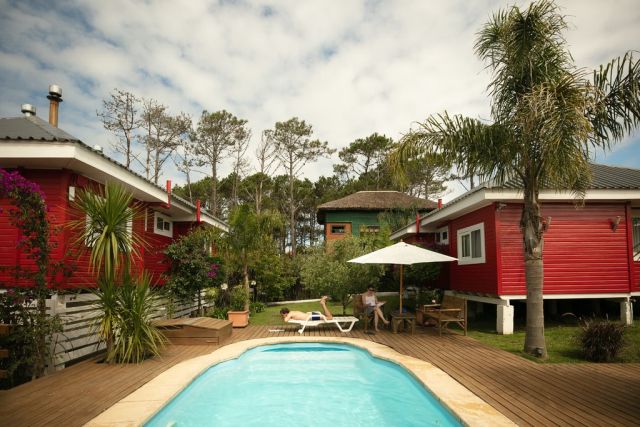 Posada Lune de Miel es una colección de cabañas pintadas de rojo dispuestas alrededor de una piscina en Punta del Diablo. La propiedad está a unas cinco cuadras de la playa. Crédito: Tali Kimelman para The New York Times.