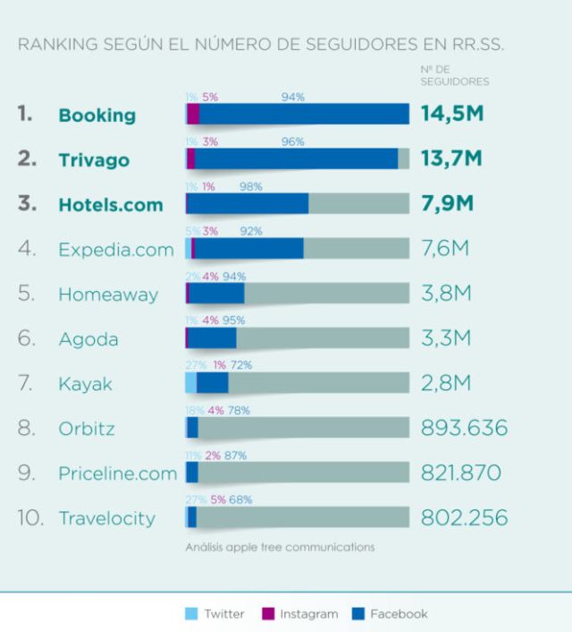 Si bien en el informe de SocialScene no han tenido en cuenta a TripAdvisor, cabe destacar que este portal entraría en el podio junto a Booking y Trivago, relegando a Hotels.com a la cuarta posición. Destaca asimismo como Expedia, la segunda OTA más importante, solo por detrás de Booking, se sitúa en un modesto quinto puesto.