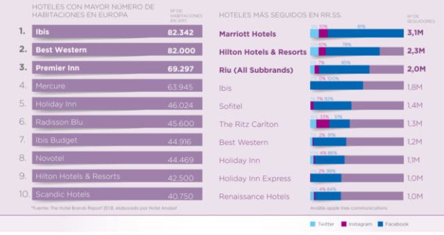Los viajeros se hospedan más en hoteles de categoría media, pero siguen en redes a los de categoría superior. Este peculiar dato se desprende del informe de SocialScene, pues si en 2017 los hoteles con mayor número de habitaciones en Europa fueron Ibis, Best Western y Premier Inn, los tres más seguidos en redes fueron Marriott, Hilton y RIU.