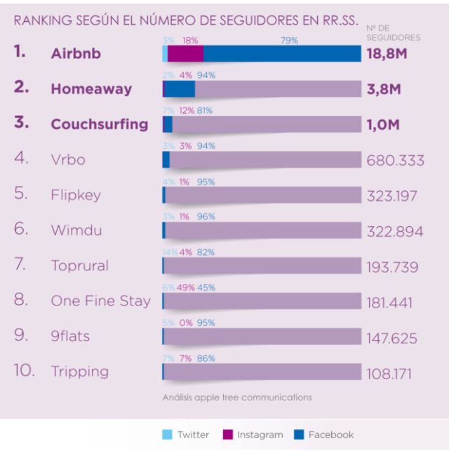 Si bien es cierto que los servicios ofrecidos no son los mismos, cada vez son más los viajeros que se decantan por un piso turístico. Dicha tendencia se puede observar en la enorme cantidad de seguidores que tiene Airbnb, con una comunidad de prácticamente veinte millones de followers, muy lejos de sus competidores directos.