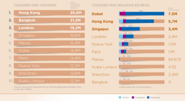 Dubai aparece en la primera posición según el número de seguidores en las redes sociales. Y, pese a estar en la sexta posición por número total de visitantes, es la ciudad con mejor uso de sus redes: hay prácticamente dos visitantes reales por cada seguidor de la ciudad en internet.