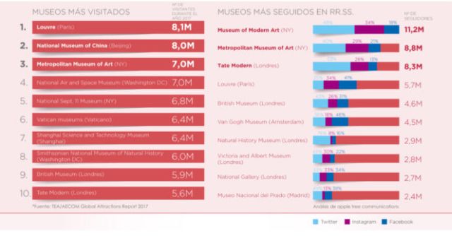 El Museo del Prado acabó 2017 muy lejos del top10 de museos más visitados del mundo, con 2,8 millones de visitas. Sin embargo, su buen trabajo en redes sociales sí se está viendo reflejado con sus más de 2,4 millones de seguidores entre Facebook, Twitter e Instagram.
