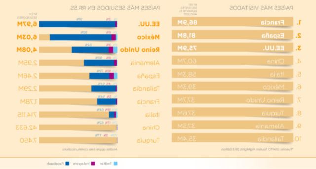 Durante 2017 y 2018, los tres países más visitados del mundo han sido Francia, España y Estados Unidos. Sin embargo, si analizamos la influencia de sus organismos turísticos en las redes sociales, EE.UU. pasaría a estar en primer lugar, seguido de México y Reino Unido (según el número total de seguidores).