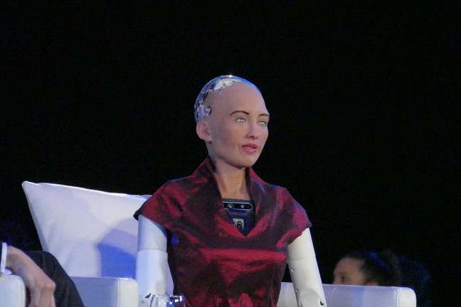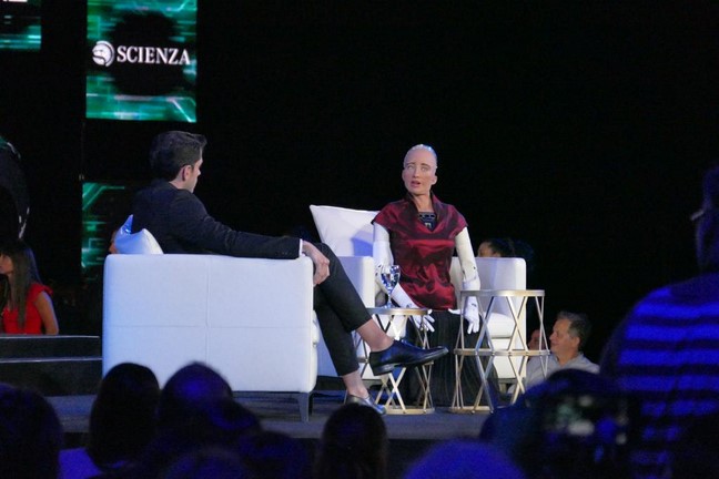 Presentada como la primera robot con ciudadanía, asombra su casi humanidad al expresarse. De todos modos nos pareció errado el mensaje para el ámbito en el que se dio. El silencio más estruendoso de la jornada se registró cuando la hicieron responder que prefería a Mujica entre los líderes latinoamericanos, ante una pregunta evitable. Una de las escasas cosas negativas que tuvo el evento, fue la falla en la traducción intentada sin éxito, al igual que la entrevista de Lecueder a Ferguson que transcurrión en inglés y no hubo traducción. Pequeños grandes detalles a tener en cuenta, los que seguramente serán atendidos en futuras ediciones.