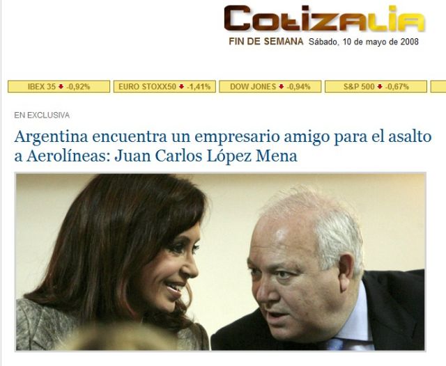También en mayo de 2008, los medios españoles se hacían eco de la noticia y anunciaban que el grupo español Marsans, tendría un socio mayoritario para conducir los destinos de Aerolíneas Argentinas. Cotizalia, la página espicializada del periódico El Confidencial, titulaba: «Argentina encuentra un empresario amigo para el asalto a Aerolíneas: Juan Carlos López Mena» y en el cuerpo del artículo expresaba: