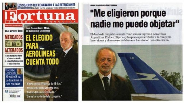 Bajo ese título, el portal argentino La Política Online, en su edición del 4 de junio de 2008, informaba de algo que ya era un secreto a voces: “López Mena es apenas la cara visible, pero el próximo dueño de Aerolíneas es otra persona”. La frase contundente salió del despacho del secretario de Transporte Ricardo Jaime, y contiene la esencia de una de las “argentinizaciones” más polémicas y forzadas que emprendió el kirchnerismo.