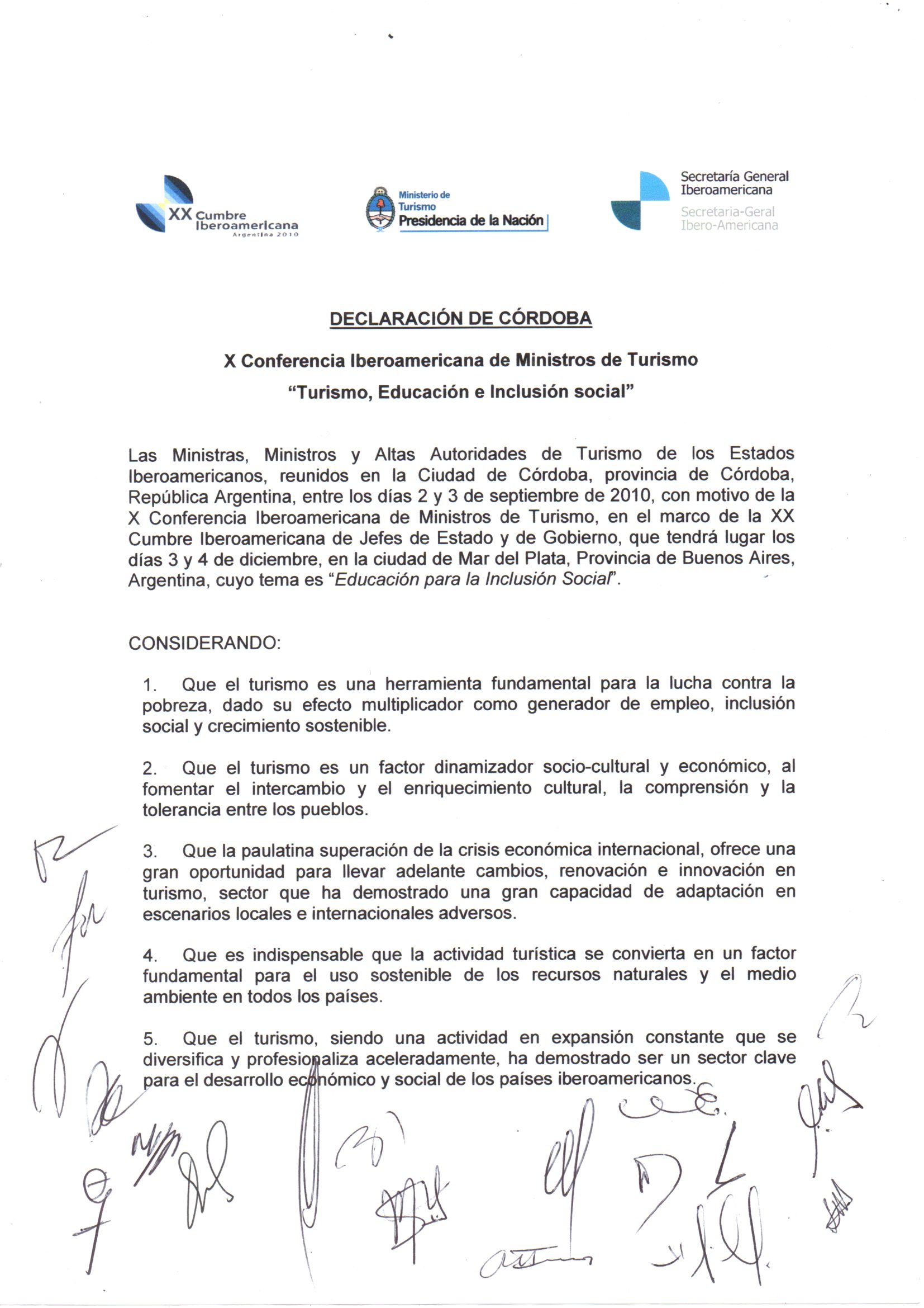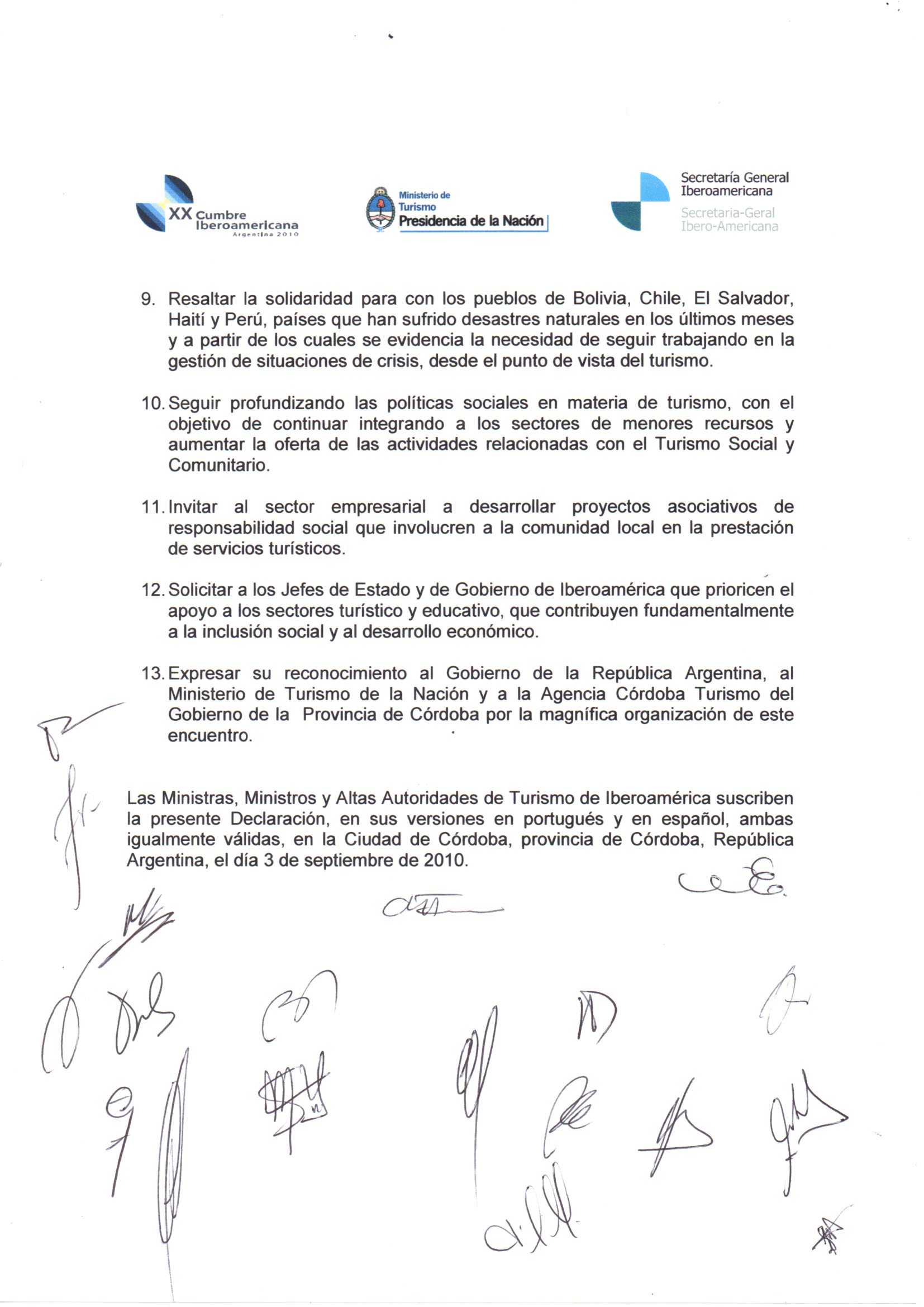 Con motivo de la X Conferencia Iberoamericana de Ministros de Turismo "Turismo, Educación e Inclusión Social", celebrada los pasados días 2 y 3 de setiembre en la ciudad de Córdoba, Argentina, en el marco de la XX Cumbre de Jefes de Estado y de Gobierno, que se realizará los días 3 y 4 de diciembre próximos en Mar del Plata, las Ministras, Ministros y Altas Autoridades del Turismo, emitieron los documentos que reproducimos en la galería de imágenes al pie de este artículo.