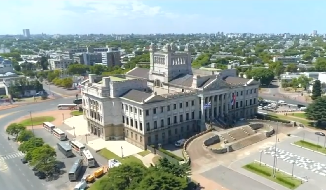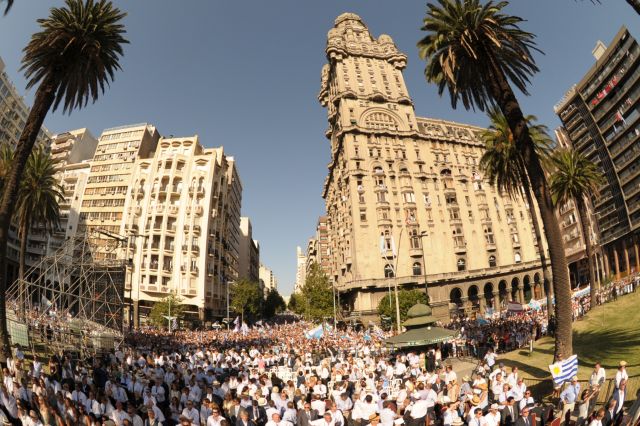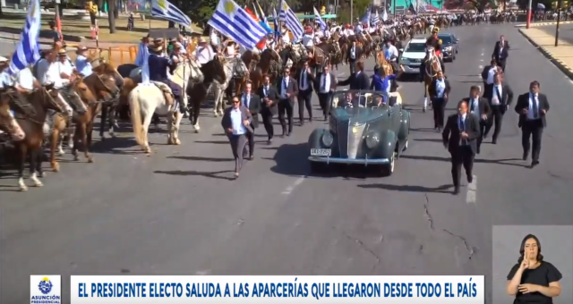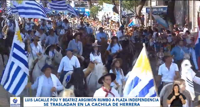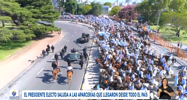 Lacalle y Argimón parten hacia la Plaza Independencia. El auto contornea todo el Palacio Legislativo pasando revista a los miles de jinetes presentes en un apretado cinturón de doble y hasta triple línea.