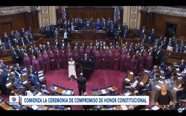 Comienza la ceremonia con la interpretación del Himno Nacional por el Coro del Sodre y la soprano Luz del Alba Rubio.