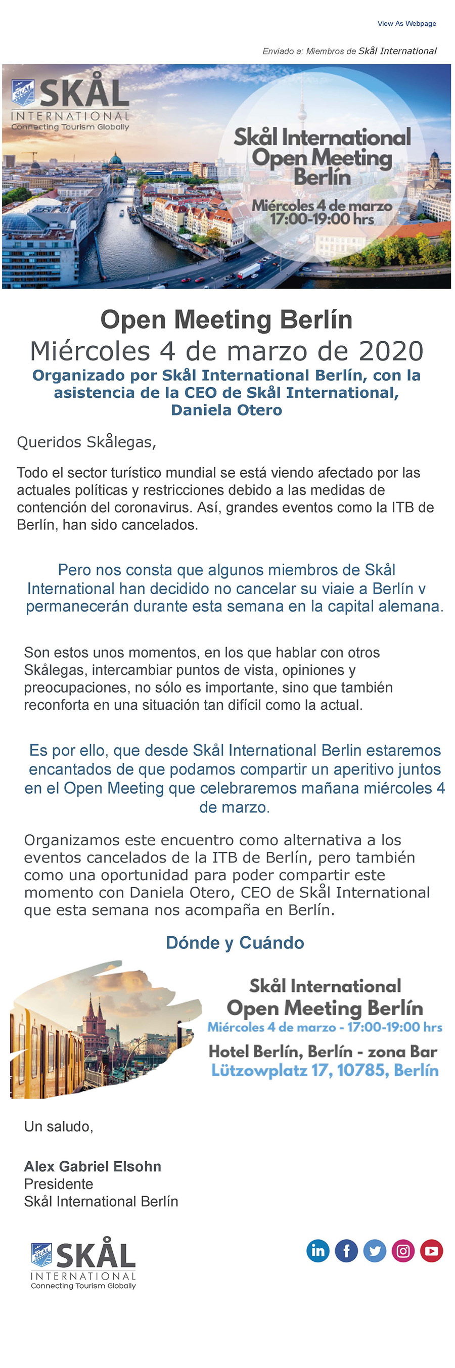 En ese artículo anunciábamos: "Desde mañana (por hoy) 4 de marzo, Portal de América informará sobre lo qué ocurre en la ciudad de Berlín luego de haberse suspendido la edición 2020 de la ITB. Cómo se viaja, cómo se vive la falta de la primer feria turística del mundo, qué dicen los principales actores, qué dice la calle. Nuestro corresponsal en España se traslada a Berlín, para buscar elementos de juicio para saber qué nos está pasando, y que le puede pasar al turismo en un mundo post-coronavirus". Cuando nuestros lectores tomen contacto con este artículo, Ramón ya estará en suelo germano y le espera un Open Meeting Berlín, al mejor estilo del Skal Club. Lo interesante del caso es leer la convocatoria a los skalegas. La compartimos.