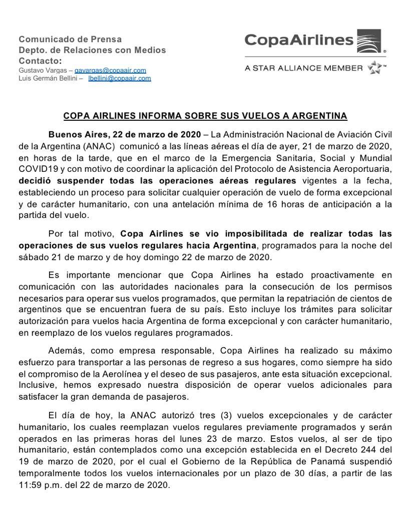 La información que venía desde tantos orígenes era coincidente, hubo un desentendimiento en un primer vuelo, luego de que las autoridades argentinas comunicaron oficialmente que "caían" todas las programaciones (vuelos regulares) y que cada empresa debería pedir autorización de cada operación como vuelo irregular. Medida a nuestro entender poco oportuna (sus razones tendría el Estado argentino) en un momento de crisis y con tanta gente alterada, exhausta, inclusive con los nervios a punto de estallar. Siguiendo con la información en nuestro poder, a partir de ese inconveniente, que motivó que un vuelo de Copa bajase en Ezeiza sin autorización previa (en el nuevo estado de excepción), la compañia, desde su central en Panamá comenzó a enviar las solicitudes con las formalidades exigidas en el estado de excepción, sin recibir respuestas desde la ANAC.