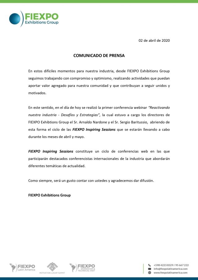 En la mañana del jueves 2 de abril, a través de Facebook Live, tuvo lugar el primer Webinar, que dio inicio con la presentación de Sergio Baritussio, para la conferencia brindada por Arnaldo Nardone. Siempre se puede, sobremanera cuando hay talento, estructura, liderazgo y profesionalismo. Esta modalidad continuará. Compartimos el Comunicado de FIEXPO Exhibition Group.