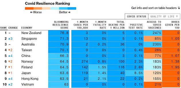 Los mejores cinco lugares del ranking de Resiliencia de Covid del primer mes de 2021 -que Bloomberg mide hasta una semana antes de finalizar el período- lo ocupan países del bloque Asia-Pacífico: Nueva Zelanda, Singapur, Australia, Taiwán y China, en ese orden.