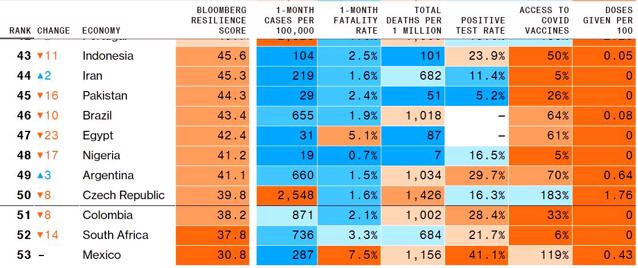 Bajo el título «La trampa de la pobreza«, el Ranking de Resiliencia de Covid de Bloomberg señala que si bien es posible que muchos países del mundo desarrollado hayan equivocado el camino al principio, debido a la naturaleza insidiosa del virus, con el paso del tiempo las economías avanzadas mejoraron su capacidad de prueba y de capacitación de los médicos para prevenir las muertes por la pandemia. «Estas ventajas no existen en América Latina y África, las regiones más devastadas por la pandemia«, punutaliza el texto y precisa que los países de estos dos continentes ocupan la mitad inferior del Ranking.