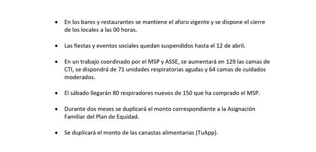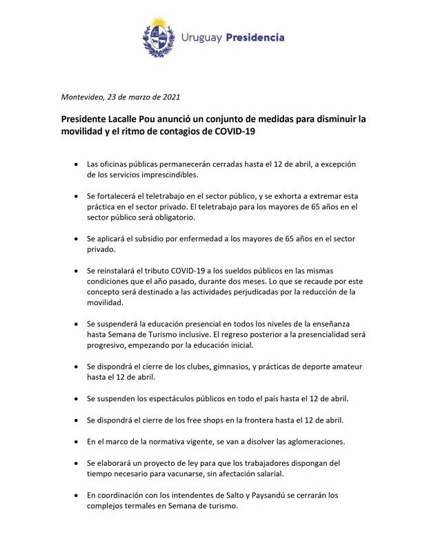 El Ejecutivo uruguayo en Consejo de Ministros ampliado definió un conjunto de medidas en procura de frenar el avance de la pandemia que se ha acelerado en el último mes, duplicándose el promedio de nuevos casos diarios y por 2,5 el promedio de muertes.