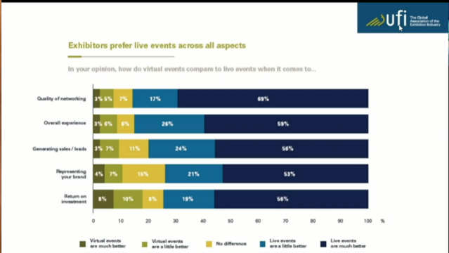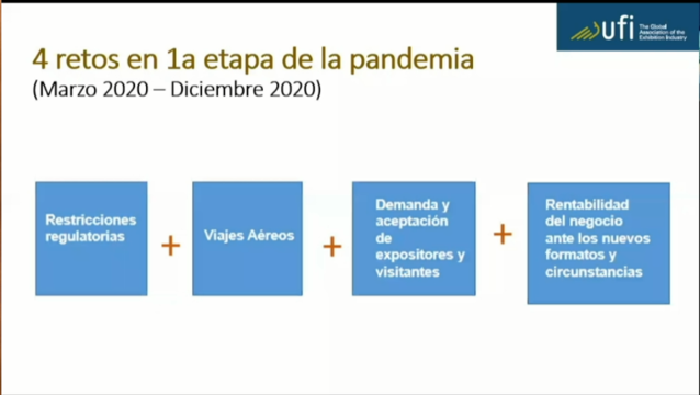 Basó su conferencia en tres estudios: "Adressing Covid-19 requirements for re-opening business events", "Global recovery insights 2020" y "UFI global exhibition barometer".