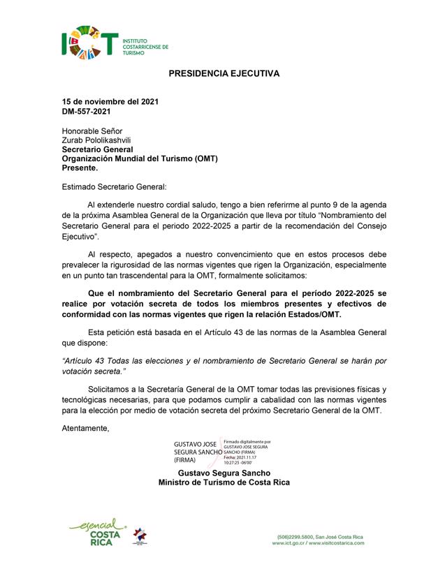 Este lunes 15 de noviembre pasado, publicamos una carta abierta a los Estados miembros de la OMT, firmada por ex altos mandos de la institución en la que se tomaba una decidida posición para que no fuese reelecto en su cargo el actual Secretario General de la Organización Mundial del Turismo, Zurab Pololikashvili para el período 2022-2025 y entre varias consideraciones, una parte de la misiva decía textualmente "A tal efecto, y de conformidad con el artículo 43 del Reglamento. de la Asamblea General, tal vez desee solicitar una votación secreta sobre este Punto del orden del día, y si la votación así lo determina, encomendar al Consejo Ejecutivo para poner en marcha un proceso electoral nuevo y adecuado". Con que uno sólo de los Estados hiciese tal solicitud alcanzaba, y esa premisa se dio en esta jornada con el pronunciamiento del Instituto Costarricense de Turismo, que por medio de una carta firmada por el Ministro de Turismo Gustavo José Segura Sancho, pide "Que el nombramiento del Secretario General para el período 2022-2025 se realice por votación secreta de todos los miembros presentes y efectivos de conformidad con las normas vigentes que rigen la relación Estados/OMT".