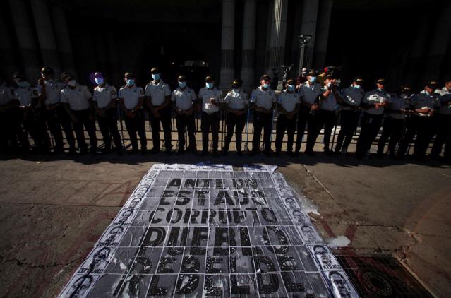 Ciudad de Guatemala, Guatemala – Oficiales de policía montan guardia durante una protesta exigiendo la renuncia del presidente Alejandro Giammattei, 31 de julio de 2021. Foto: Sandra Sebastian/REUTERS