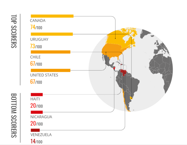 Con un puntaje de 73, Uruguay se consolida como uno de los países mejor puntuados de la región. Esto demuestra que instituciones democráticas fuertes y estables, un poder judicial independiente y la protección de los derechos básicos son vitales para evitar que la corrupción penetre en el Estado. Las sólidas instituciones de Uruguay también le han permitido al país navegar la pandemia de manera efectiva , transparente y con el apoyo de su población, a diferencia de la mayoría de los países de la región.