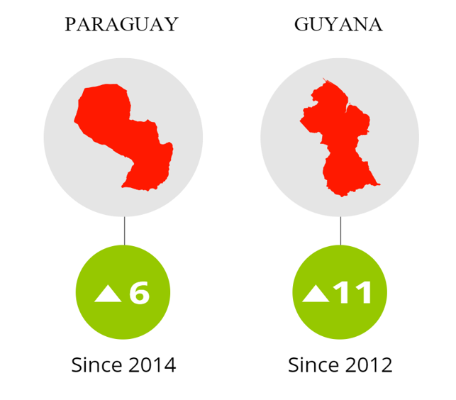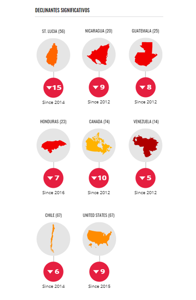 Este año la región de las Américas incluye 22 países que no muestran cambios estadísticamente significativos en sus niveles de corrupción. En los últimos 10 años, solo Guyana (puntuación del IPC: 39) y Paraguay (30) han logrado mejoras notables. En el mismo período, tres de las democracias más fuertes de la región —Estados Unidos (67), Chile (67) y Canadá (74), que lideran el ranking este año— muestran una caída, mientras que solo Uruguay (73) se mantiene estable. Venezuela , Haití y Nicaragua , estados no democráticos que experimentan crisis humanitarias, obtienen los puntajes más bajos con 14, 20 y 22 puntos, respectivamente.