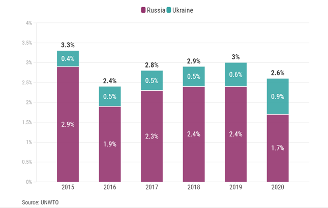 Como destinos turísticos, Rusia y Ucrania representan el 4 % de las llegadas de turistas internacionales a Europa, pero solo el 1 % de los ingresos por turismo internacional de Europa .