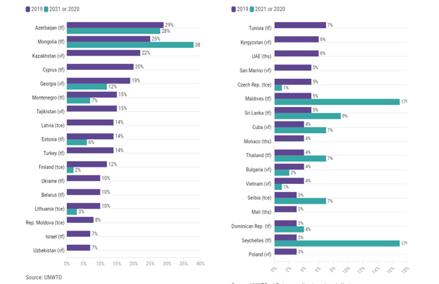 En 2019, el gasto ruso en viajes al extranjero alcanzó los 36.000 millones de dólares estadounidenses y el gasto ucraniano de 8.500 millones de dólares estadounidenses. En 2020, estos valores se redujeron a US$ 9,1 mil millones y US$ 4,7 mil millones, respectivamente