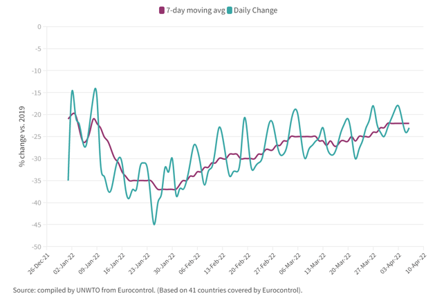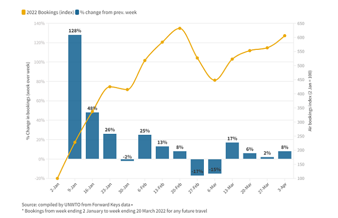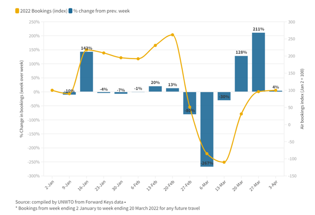El conflicto podría ralentizar la recuperación a pesar del levantamiento o relajación de las restricciones de viaje por parte de muchos destinos (un total de 12 países habían levantado todas las restricciones relacionadas con el COVID-19 al 24 de marzo de 2022).
