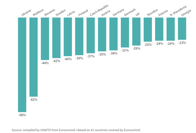 Como mercados emisores, Rusia y Ucrania representan un 3 % combinado del gasto mundial en turismo internacional a partir de 2020. Un conflicto prolongado podría traducirse en una pérdida de 14 000 millones de USD en ingresos por turismo a nivel mundial en 2022.