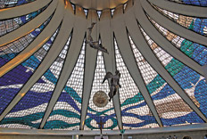 En el Eje Monumental también están el Palacio de Itamaraty (Ministerio de Relaciones Exteriores) y La Explanada de los Ministerios, un gran espacio verde flanqueado por dos hileras de edificios exactamente iguales que suman un total de 17 moles albergando los ministerios. Al final se levanta la Catedral Metropolitana Nossa Senhora do Aparecida, levemente apartada del eje porque en la sociedad democrática la Iglesia está separada del Estado. Esta catedral quizá sea la obra más inspirada de Niemeyer en Brasilia. Se trata de un edificio con planta circular que carece de fachada y tiene la forma de una gran corona de espinas. Se ingresa por una galería en penumbras que desciende a un subsuelo –simbolizando la entrada a las catacumbas romanas– para desembocar en un ambiente circular cuyo techo completo es un gran vitral de absoluta luminosidad del cual cuelgan imágenes de ángeles que parecen flotar en el aire.