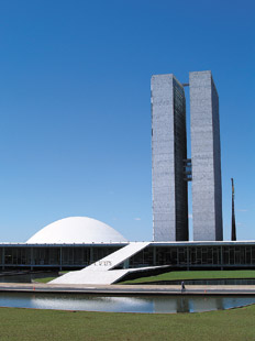 Los edificios principales de esta estructura general se le encargaron a Oscar Niemeyer. El espacio más llamativo de la ciudad es el famoso Eje Monumental surcado por tres calles paralelas y una gran cantidad de edificios creados por Niemeyer. A la cabeza del eje está la Plaza de los Tres Poderes, un gran espacio abierto de concreto con tres edificios formando un triángulo imaginario, que simboliza la independencia de los tres estamentos de la democracia. En la base del triángulo están enfrentados la Corte Suprema y el Planalto, y en el ángulo superior está el Congreso Nacional. El Planalto es la sede del Poder Ejecutivo. Y a metros de allí está el Congreso Nacional con sus dos cúpulas –una cóncava y otra convexa–, cubriendo las Cámaras de Senadores y Diputados.