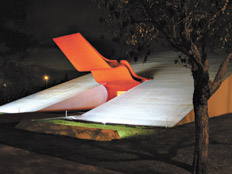 En el Parque Ibirapuera, el pulmón verde de la polucionada San Pablo, Niemeyer hizo su última travesura: un teatro para eventos musicales inaugurado en 2005. Su forma es una especie de trapecio acostado pintado de blanco cuya entrada está cubierta por un techo rojo con forma de rayo.