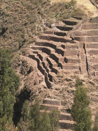 Apenas unos minutos de viaje y la ruta se interna en el valle siempre acompañado por el serpenteante cauce del Vilcanota, el río sagrado del Tawantinsuyo, con verdes sembradíos orlados por impresionantes nevados. Comienzan a aparecer entonces los andenes que se derraman sobre las laderas de las montañas como jardines colgantes de curiosas geometrías.