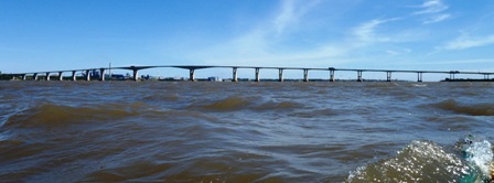 El Puente Internacional cambió la vida de Fray Bentos y también la de Puerto Unzué, que no se hagan los locos que a ellos también les vino requetebién, hasta el punto que desde Chile y buena parte de las provincias argentinas llegan hasta la ciudad de los ambientalistas los camiones repletos de mercaderías hacia Brasil, ida y vuelta, en un sentido y en el otro. El puente une a esas dos ciudades a lo largo de 5,36 kilómetros y se eleva sobre el río Uruguay a 44,5 metros de altura. Un disparate. Cuando se inauguró en 1976 nuestro país estaba en plena dictadura.